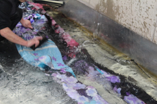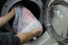 前検品をした上で下洗いをし1枚づつネットに入れ着物専用の溶剤を使用し、